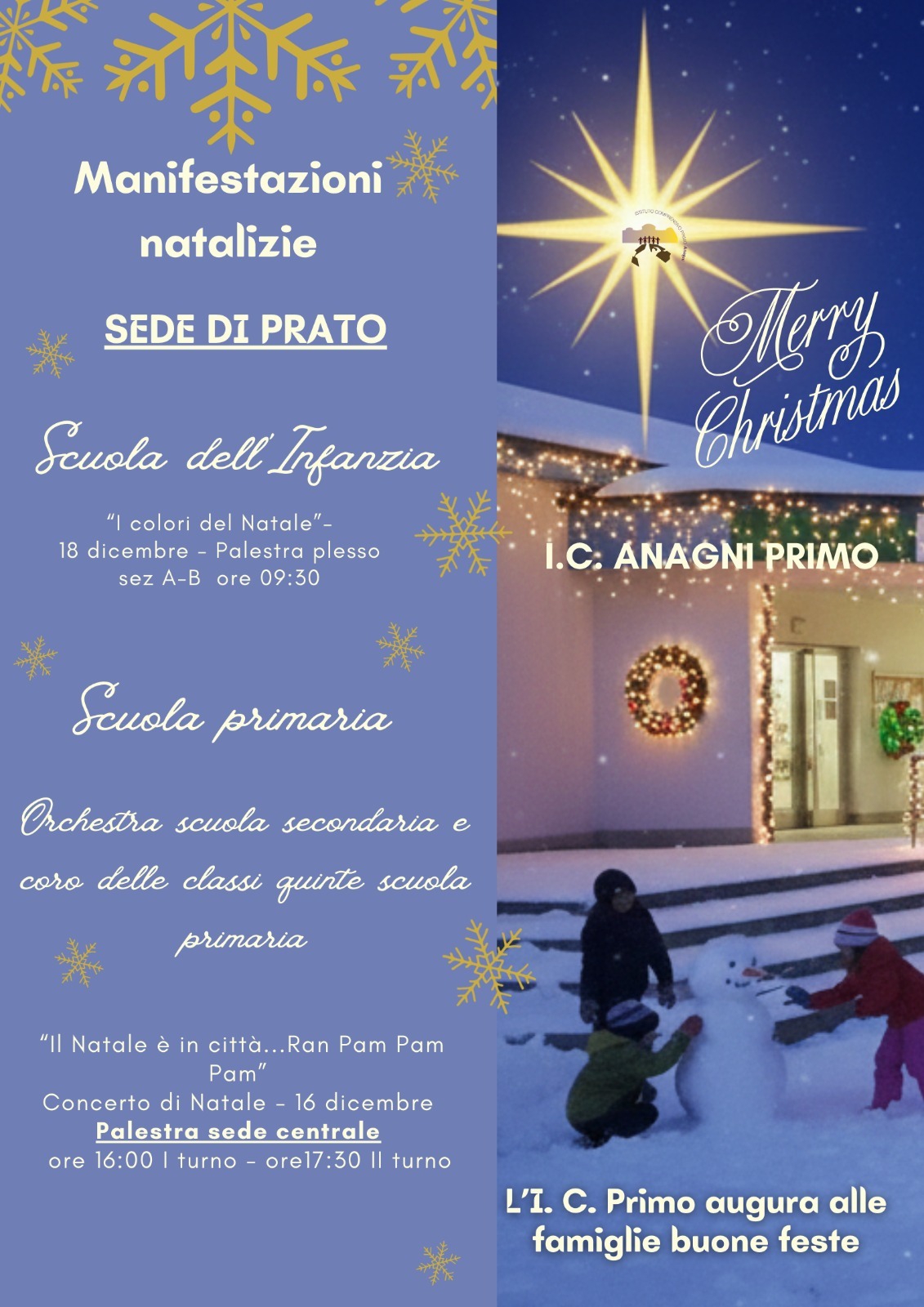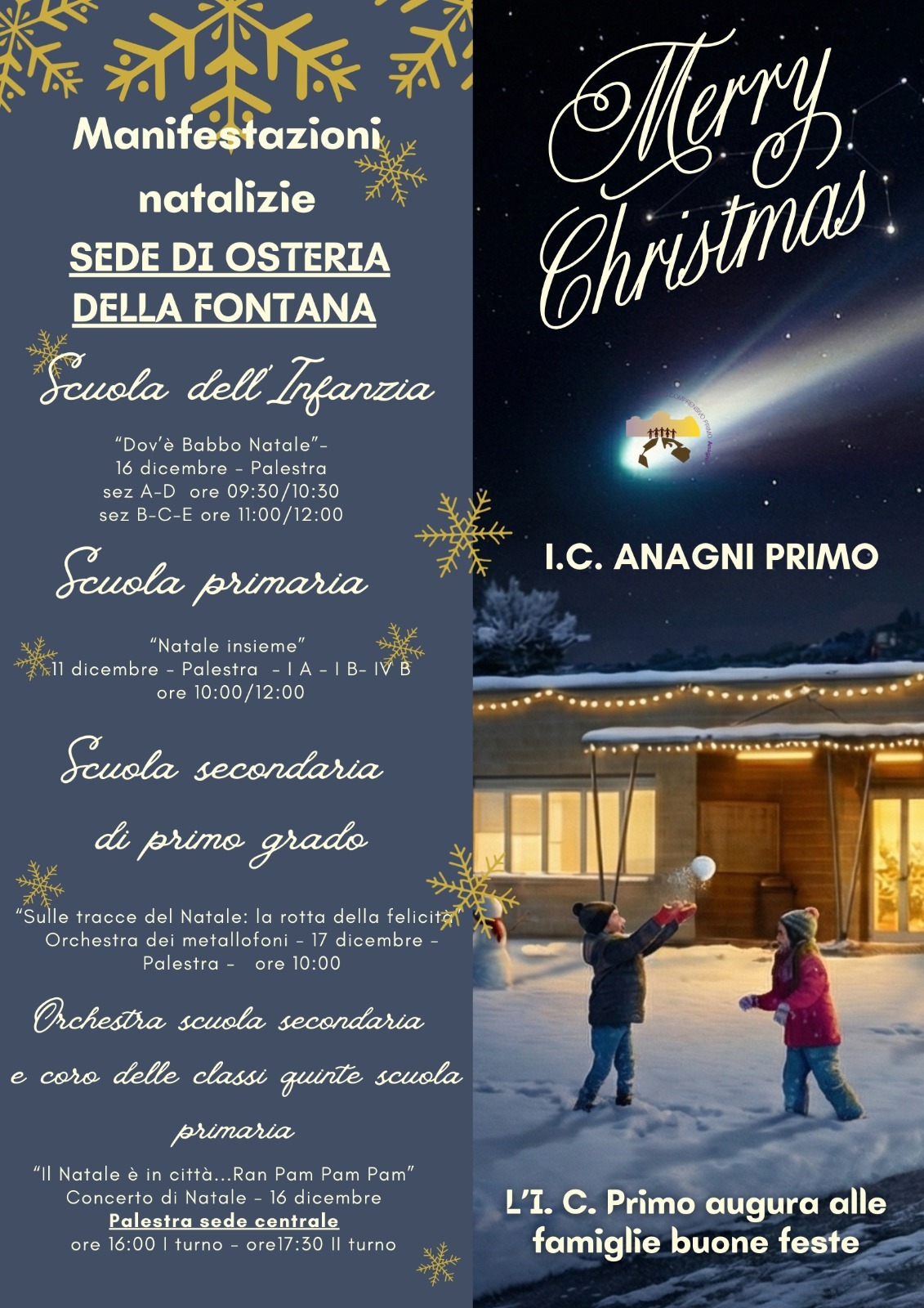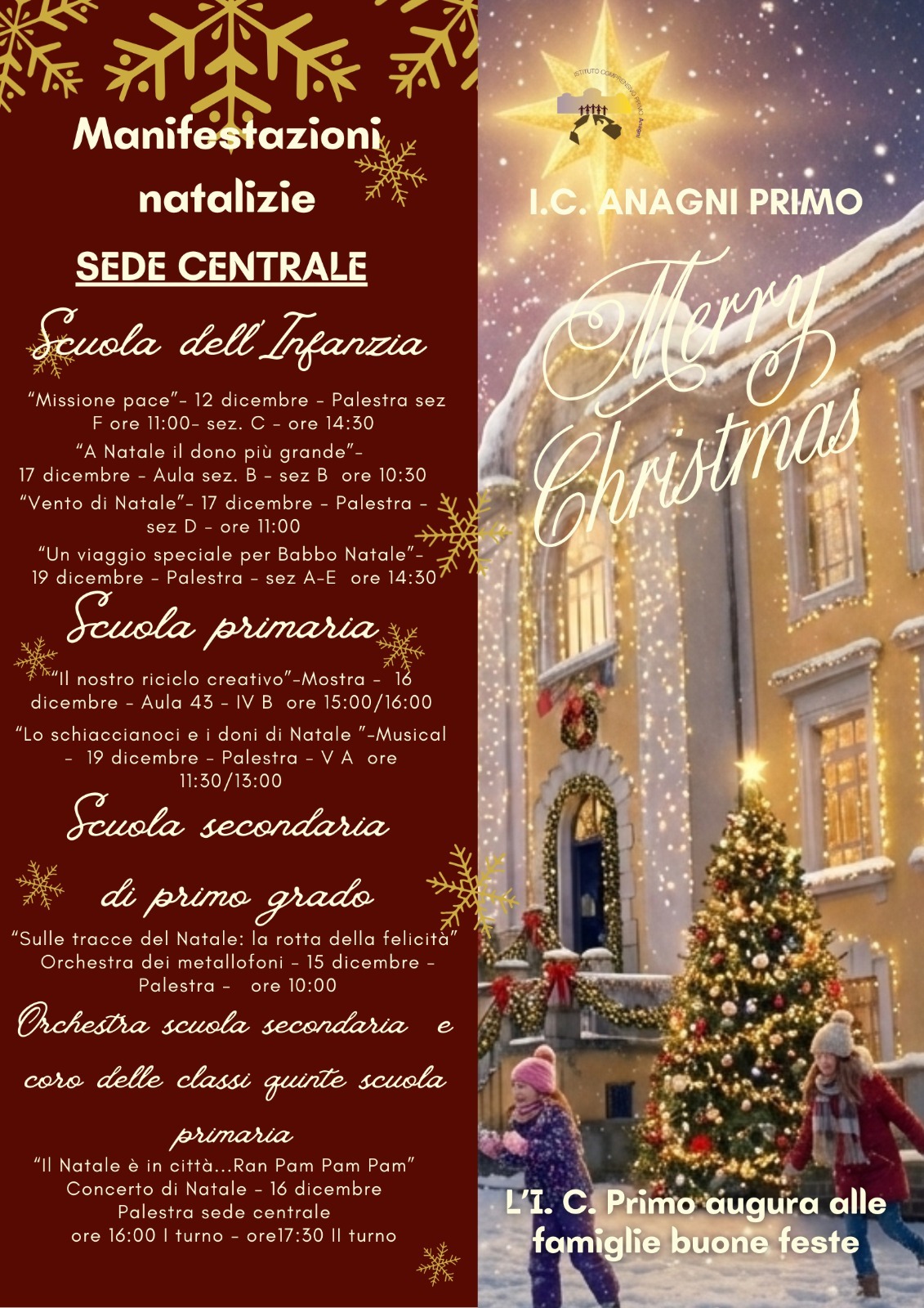 Il periodo natalizio è arrivato anche all’I.C. Anagni Primo e in tutti i nostri plessi – San Bartolomeo, Centrale, Osteria della Fontana e Prato – i bambini e i ragazzi stanno preparando momenti ricchi di musica, creatività e condivisione. Ogni sede offrirà alle famiglie occasioni diverse per vivere insieme l’atmosfera del Natale e valorizzare il lavoro svolto in queste settimane.