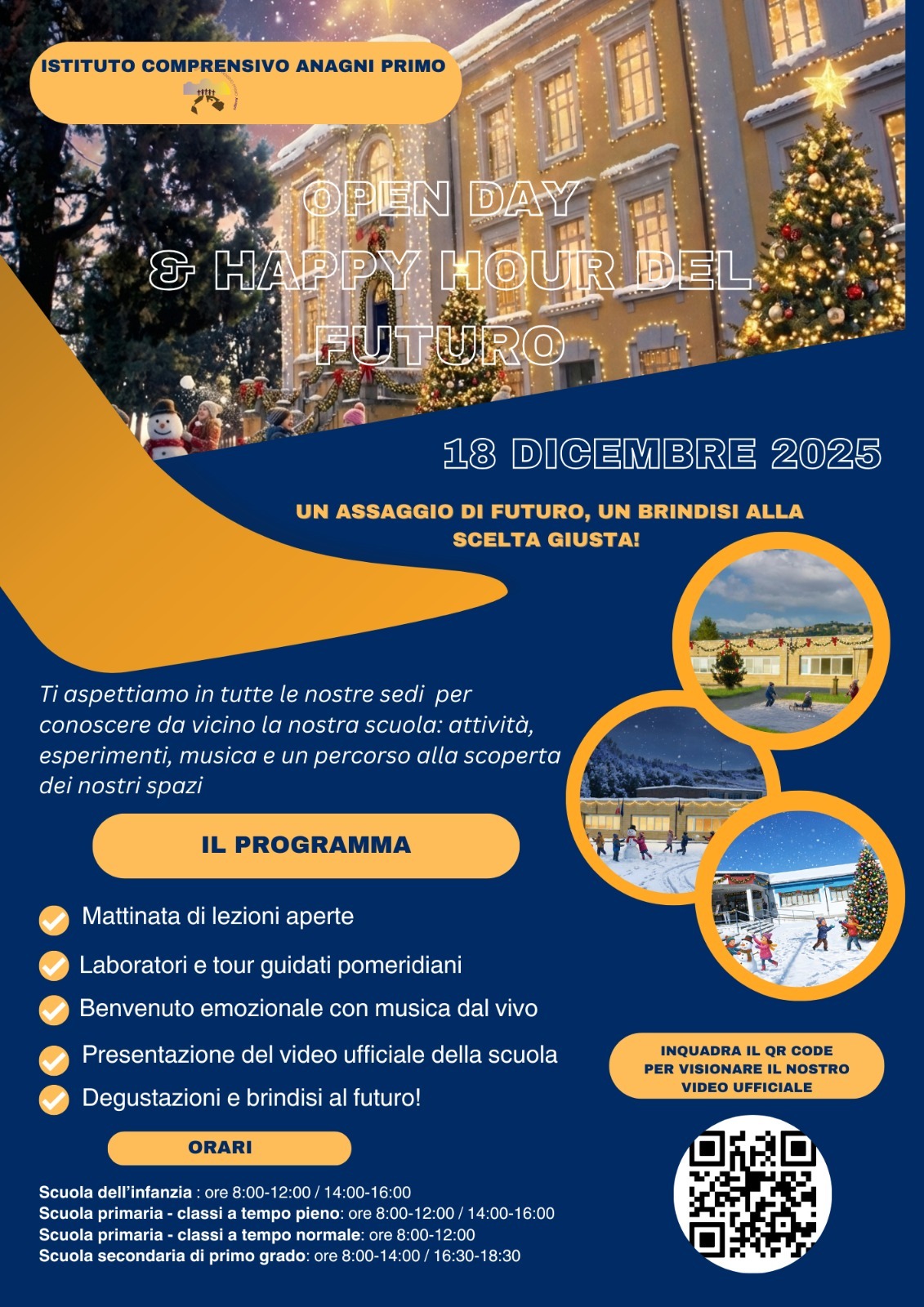 Il 18 dicembre apriremo inoltre le porte della scuola con l’Open Day & Happy Hour del Futuro: un momento dedicato all’incontro, alla scoperta dei nostri spazi e alla presentazione delle attività che caratterizzano il nostro Istituto.